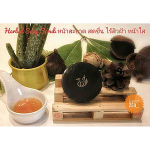 เฮอร์เบิ้ล โซปสครับ (สบู่สมุนไพรชัดผิว)Natural Herbal Soap Scrub (for Face and Body) .ใช้ขัดหน้าประมาณ 2 นาทีก่อนการล้างหน้าด้วยน้ำสะอาด หรือ พอกประมาณ 3-5 นาที ผิวหน้ามัน ก่อนการขัด และล้างออก ผิวหน้าแห้งไม่ควรพอก หรือพอก อาทิตย์ละ 1 ครั้ง ผิวหน้ามันมากและมีสิวสามารถพอกได้ทุกวันก่อนการอาบน้ำ ขจัดเซลผิวเก่า ฟื้นฟูผิวใหม่ ช่วยให้ผิวกระจ่างใส ลดความหมองคล้ำ และจุดด่างดำ สัมผัสได้แต่แรกใช้ เลขจดแจ้ง 10-1-6100062270 สารสำคัญ วิตามิน C น้ำผึ้ง คาโนลิน น้ำมันงาม้อนสกัดเย็น น้ำมันทานตะวันสกัดเย็น น้ำมันมะพร้าวสกัดเย็น สารสกัดมะขาม ผงสมุนไพร สมอพิเภก ไพล ขมิ้นชัน ทองพันชั่ง ขนาด 50 g ราคา320 บาท